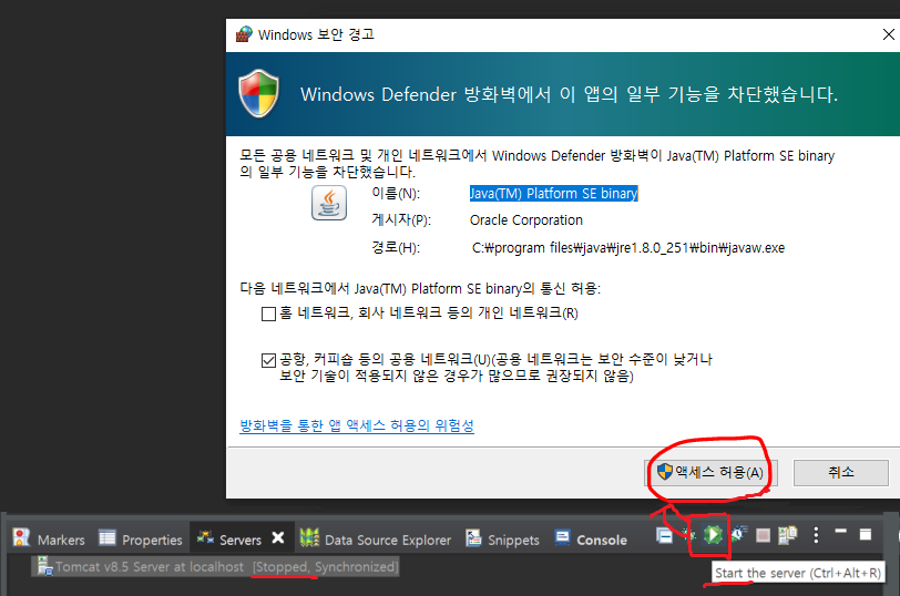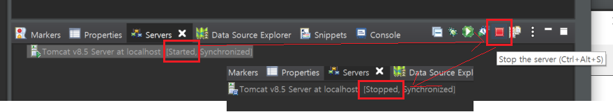 ㄴ Start 누르면, 아까까지, Server [ Stopped, ] 였는데 [Started , ] 로 바뀜