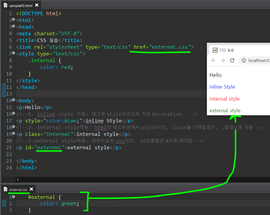 3.external style적용: 외부파일로 css정의. id호출할땐 #으로 해야함