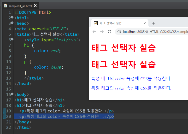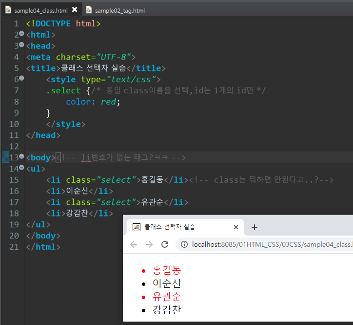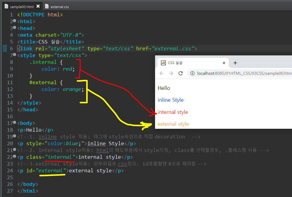 2. internal style적용: html의 헤드부분에서 style지정, class를 선택할경우, .클래스명 사용
