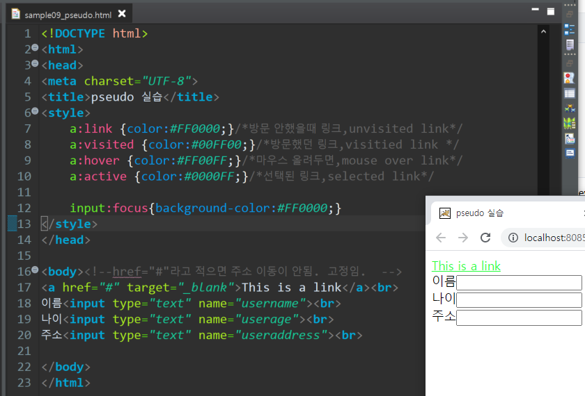a:hover {color:#FF00FF;} /*마우스 올려두면,mouse over link*/