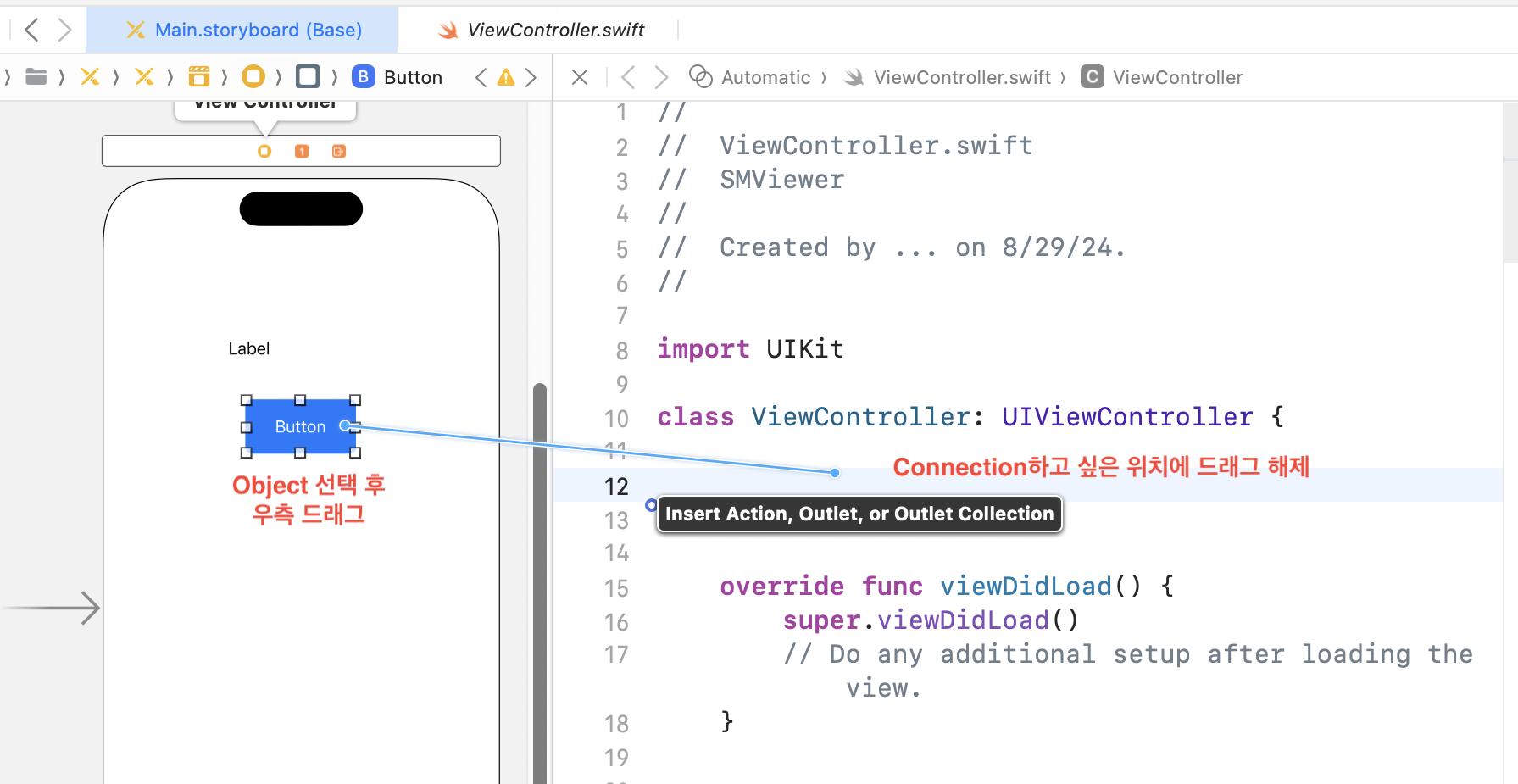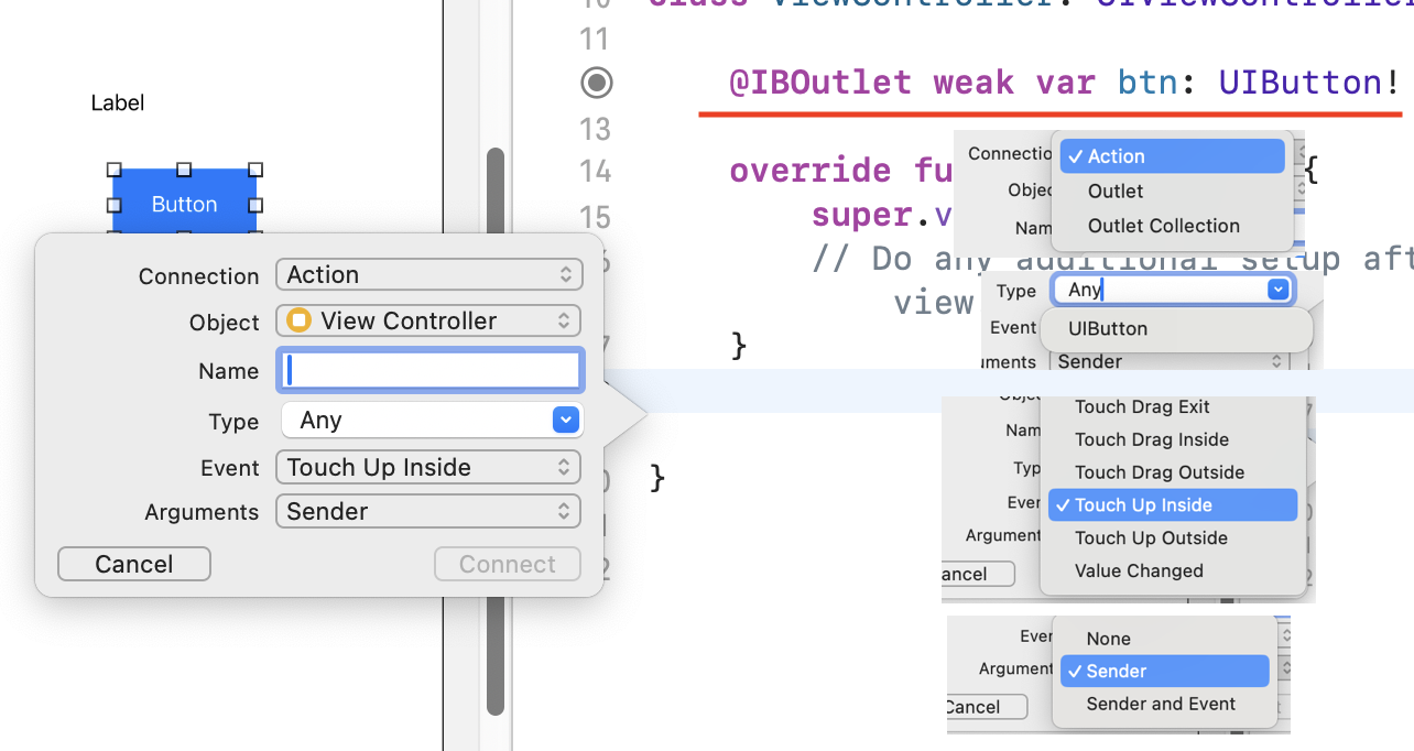 2) 그 후에 해당 Object의 Action을 Connection 해주는 IBAction 사용하여 동작 함수로 선언.