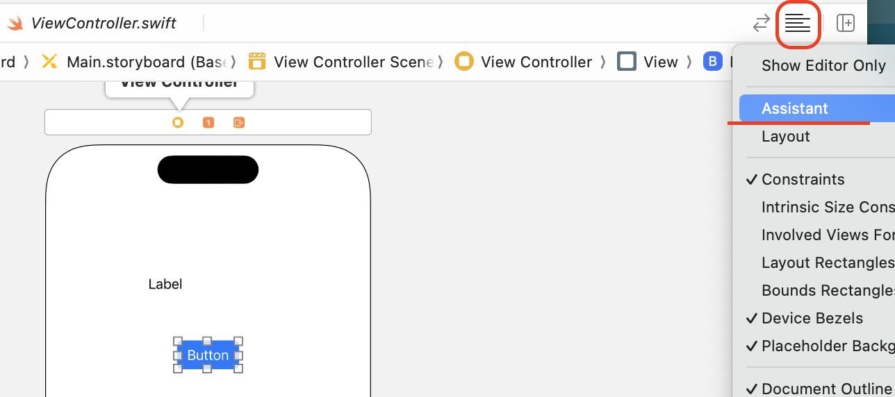 스토리보드에서 추가한 오브젝트를 뷰와 Connection 시키기 위해서 뷰를 보조로 볼 수 있게 열기
