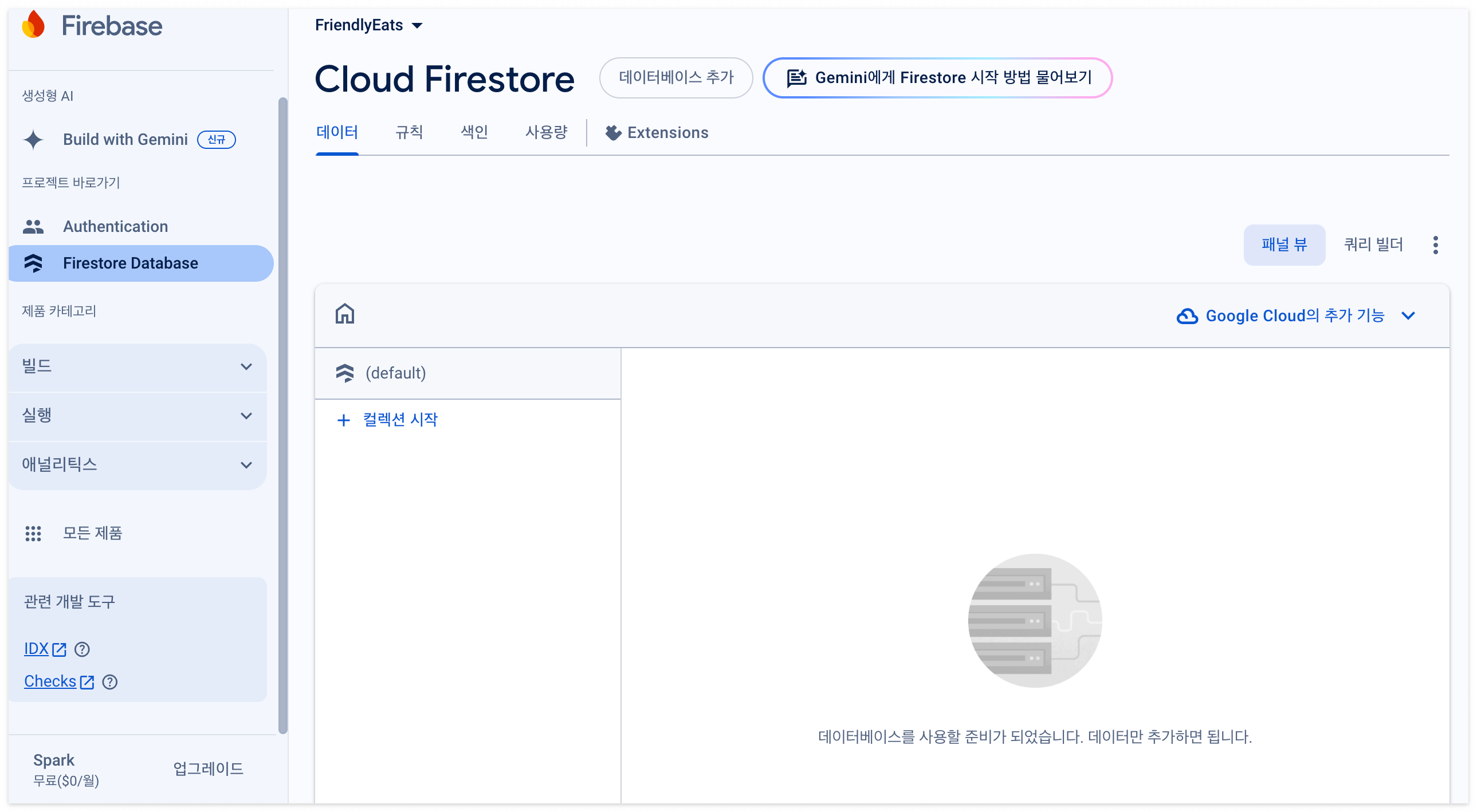 빌드 \ Firestore Database \ 데이터베이스 만들기