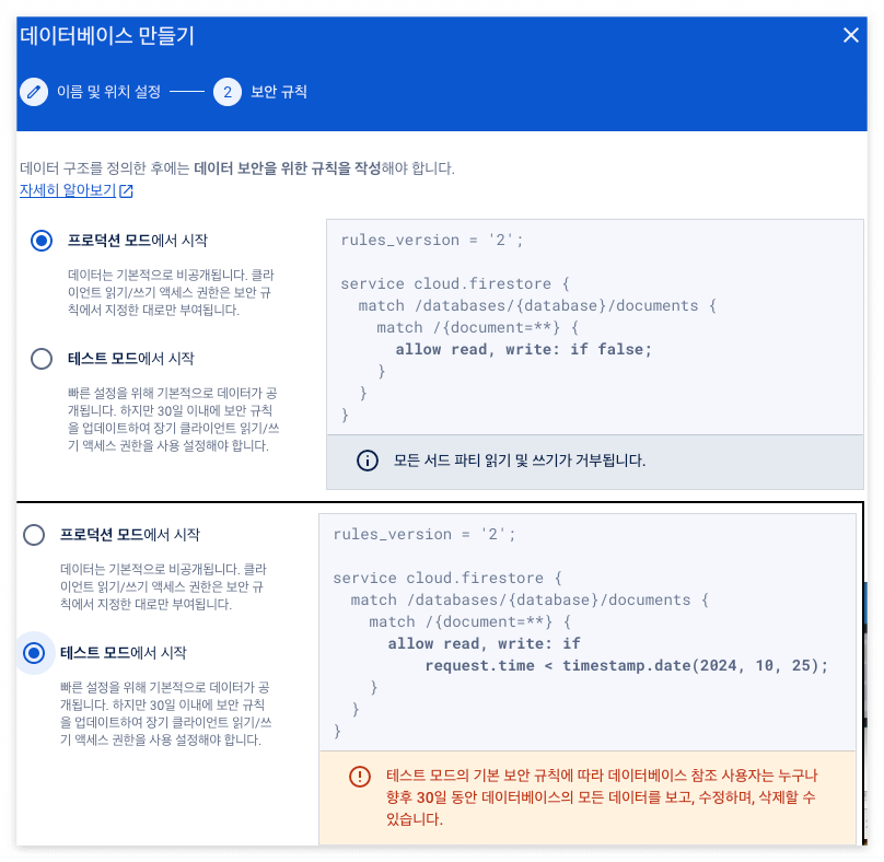 맨처음 '데이터베이스 만들기'에선 [프로덕션/테스트] 선택만 할 수 있어서