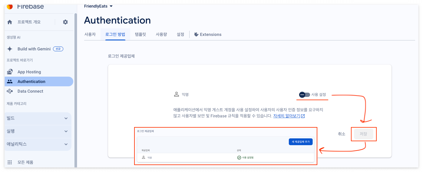빌드 \ Authentication \ 로그인 방법 \ 익명 \ 사용설정 ON , 저장